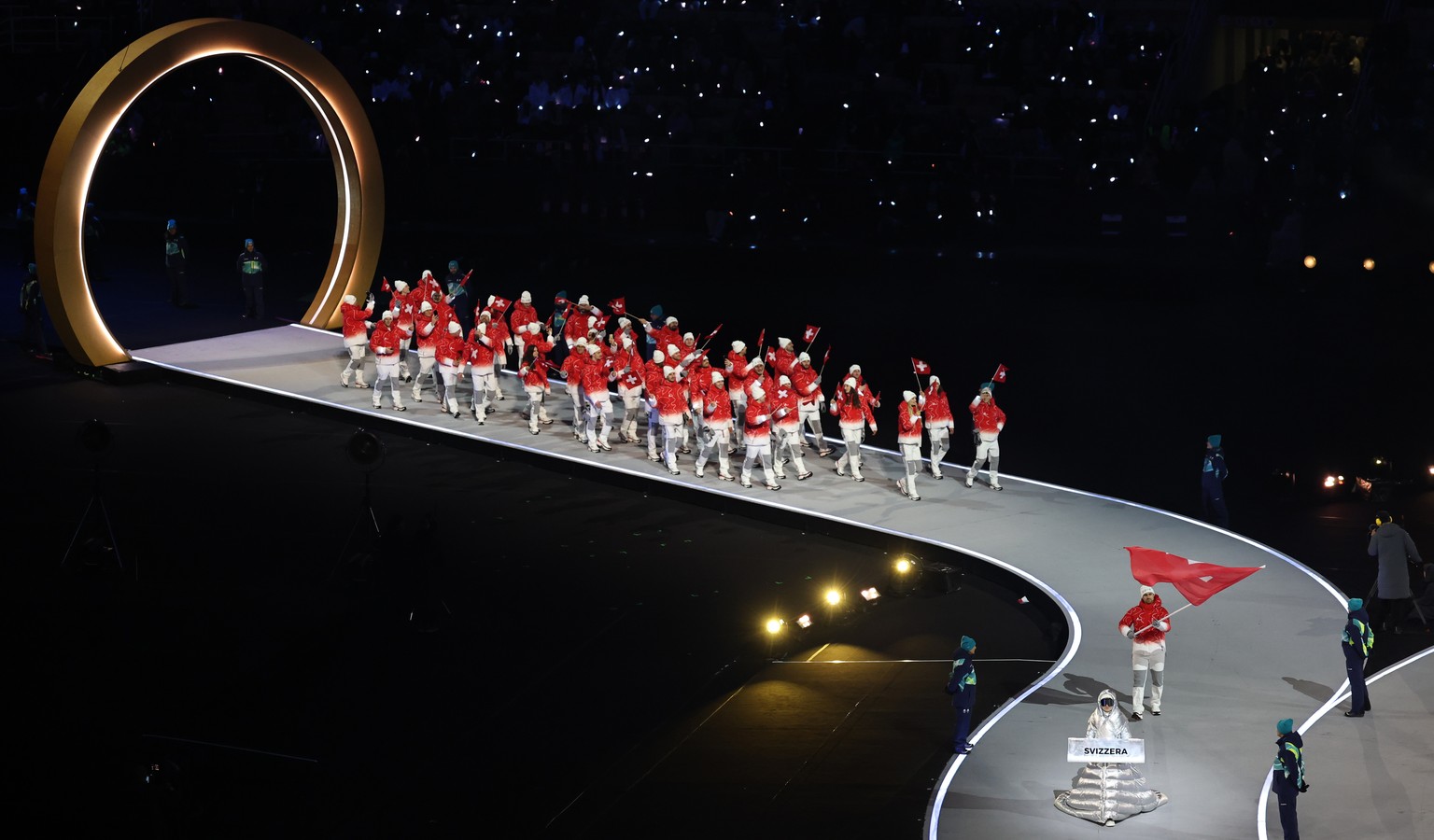 Die Schweizer Delegation wird als 80. von 92 Nationen einlaufen. Es dauert also noch ein bisschen, bis wir die Fahnenträger Fanny Smith und Nino Niederreiter sehen.