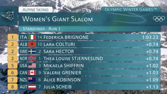 Grosse Verliererin war Julia Scheib. Der Österreicherin fehlten als Fünfte sieben Hundertstel für eine Medaille. Scheib hatte in diesem Winter vier von acht Weltcup-Riesenslaloms gewonnen.