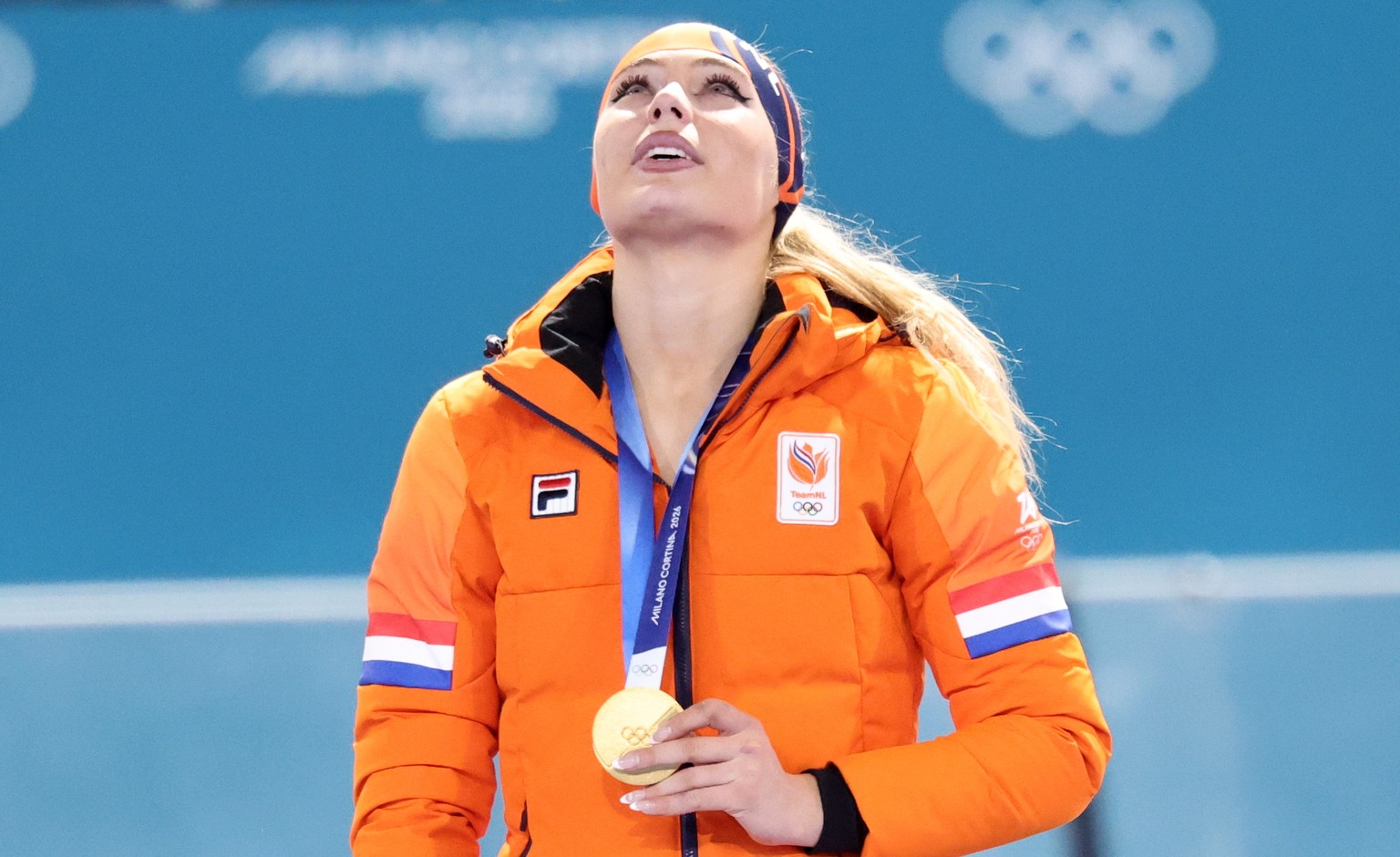 epa12720926 Gold medalist Jutta Leerdam of the Netherlands looks on after the Women's 1000m of the Speed Skating competitions at the Milano Cortina 2026 Winter Olympic Games, in Milan, Italy, 09  ...