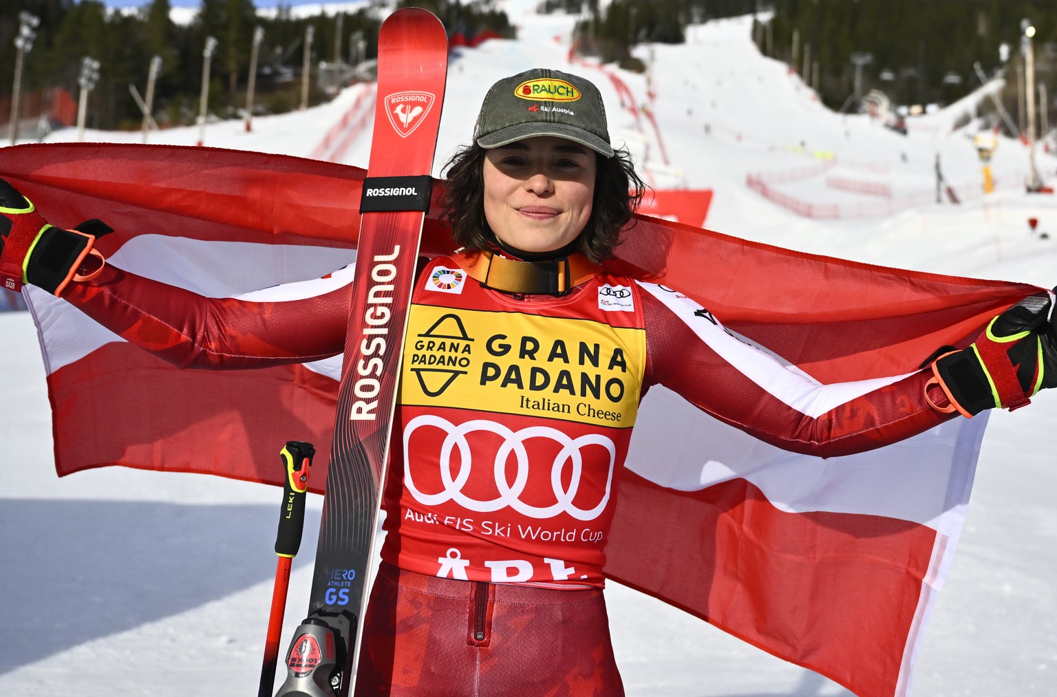 epa12818989 Gold medalist Julia Scheib of Austria celebrates after winning the women's Giant Slalom race at the FIS Alpine Skiing World Cup in Are, Sweden, 14 March 2026. EPA/PONTUS LUNDAHL SWEDE ...