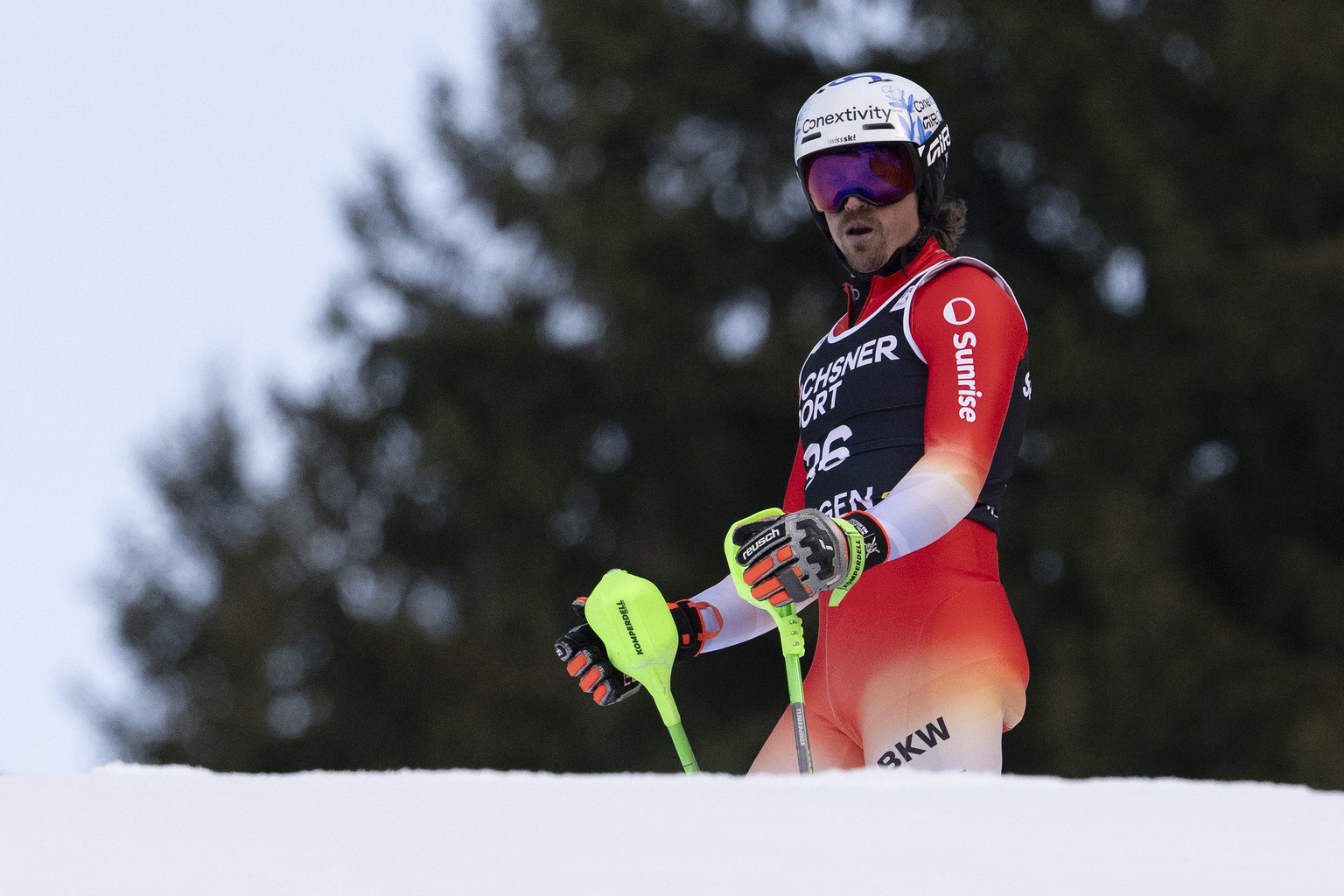 KEYPIX - Marc Rochat of Switzerland reacts during the first run of the men's Slalom race at the Alpine Skiing FIS Ski World Cup, in Wengen, Switzerland, Sunday, January 18, 2026. (KEYSTONE/Jean-C ...