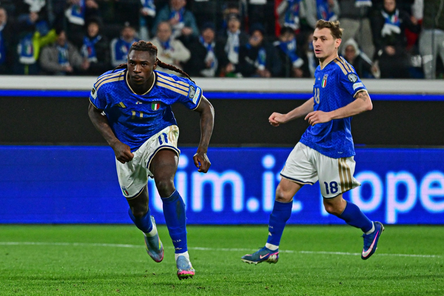 epa12852595 Italy?s Moise Kean (L) celebrates scoring the 2-0 goal during the FIFA World Cup 2026 qualifiers playoff semifinal soccer match between Italy and Northern Ireland, in Bergamo, Italy, 26 ma ...
