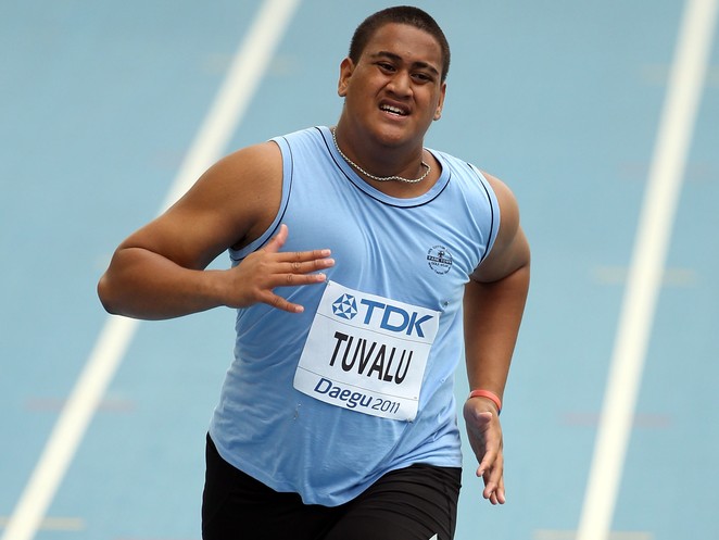 27.08.2011: Ein samoanischer Kugelstösser läuft an der WM über 100 Meter mit 15,66 Sekunden persönliche Bestzeit