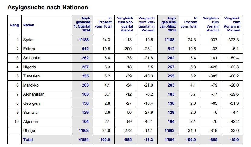 In der Schweiz ersuchten im ersten Quartal 2014 beinahe 1200 Syrer um Asyl. Sie machten – vor jenen aus Eritrea und Sri Lanka – fast ein Viertel aller Asylanträge aus. Im gesamten Jahr 2013 gab es 1'901 Asylgesuche von syrischen Flüchtlingen.