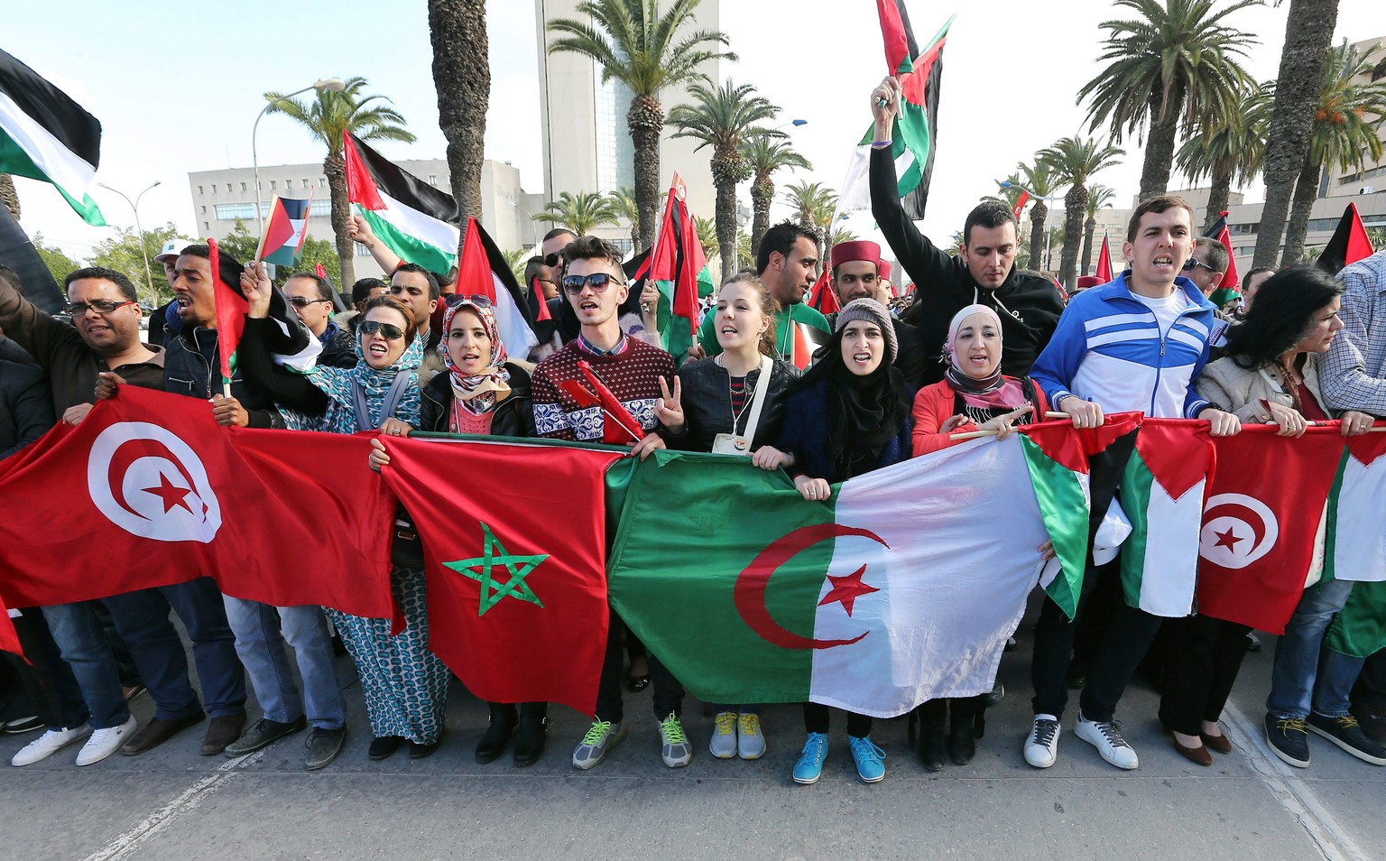 «Freies Tunesien, Terrorismus raus», skandierten die Teilnehmer des Protestmarschs, der unter umfangreichen Sicherheitsvorkehrungen stattfand. Die Polizei schätzte die Teilnehmerzahl am späten Vormittag auf etwa 12'000. Erwartet wurden auch ausländische Staatschefs wie Frankreichs Präsident François Hollande.