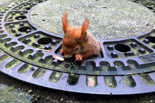 Zu viele Nüsse gegessen? Pummeliges Eichhörnchen bleibt in Schachtdeckel stecken
