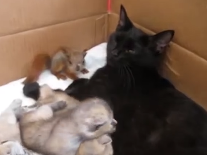 Katze findet im Garten Baby-Eichhörnchen und wird ihre neue Mama