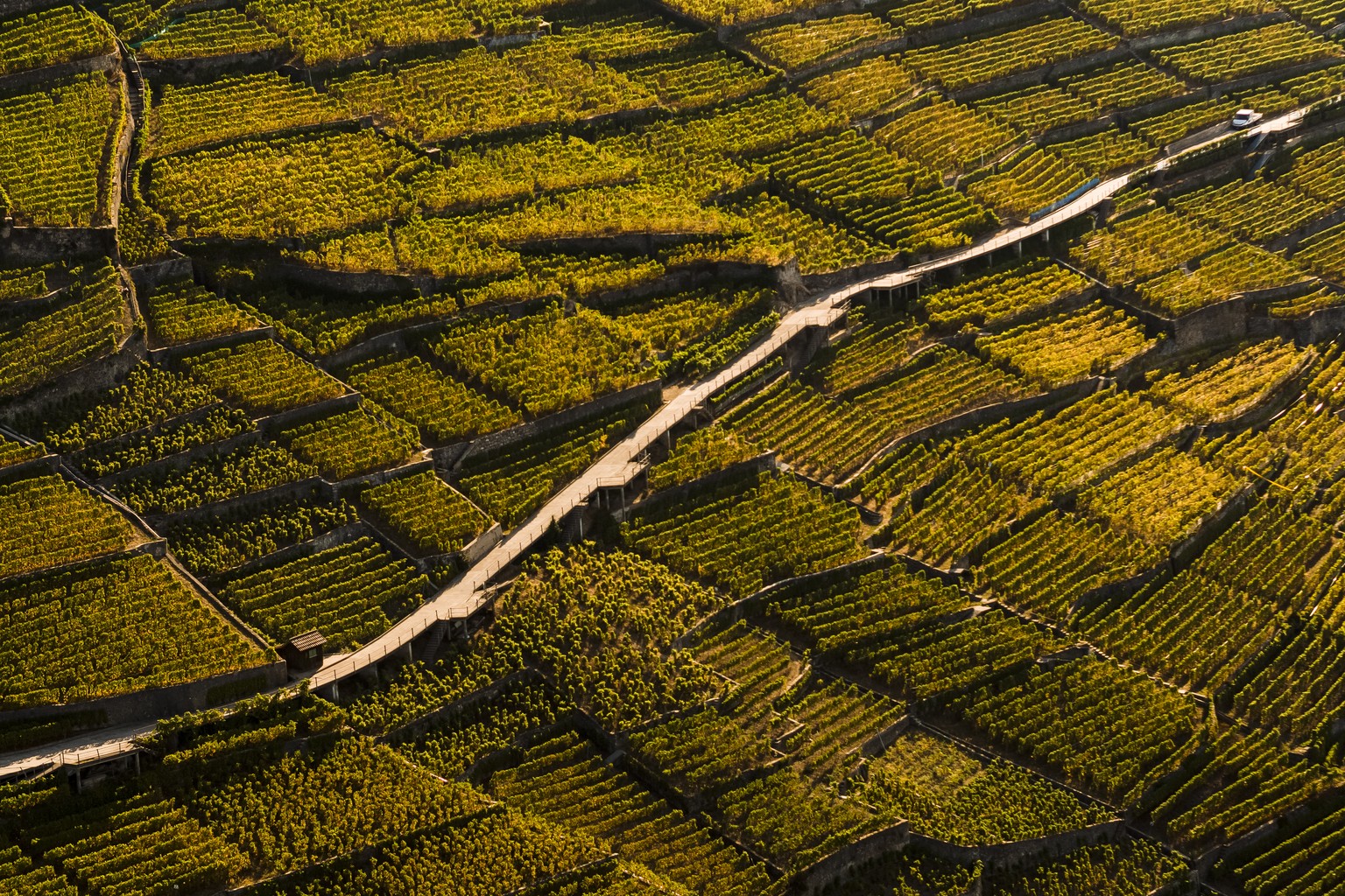 Luftaufnahme von einem Rebberg in Puidoux am Genfersee.