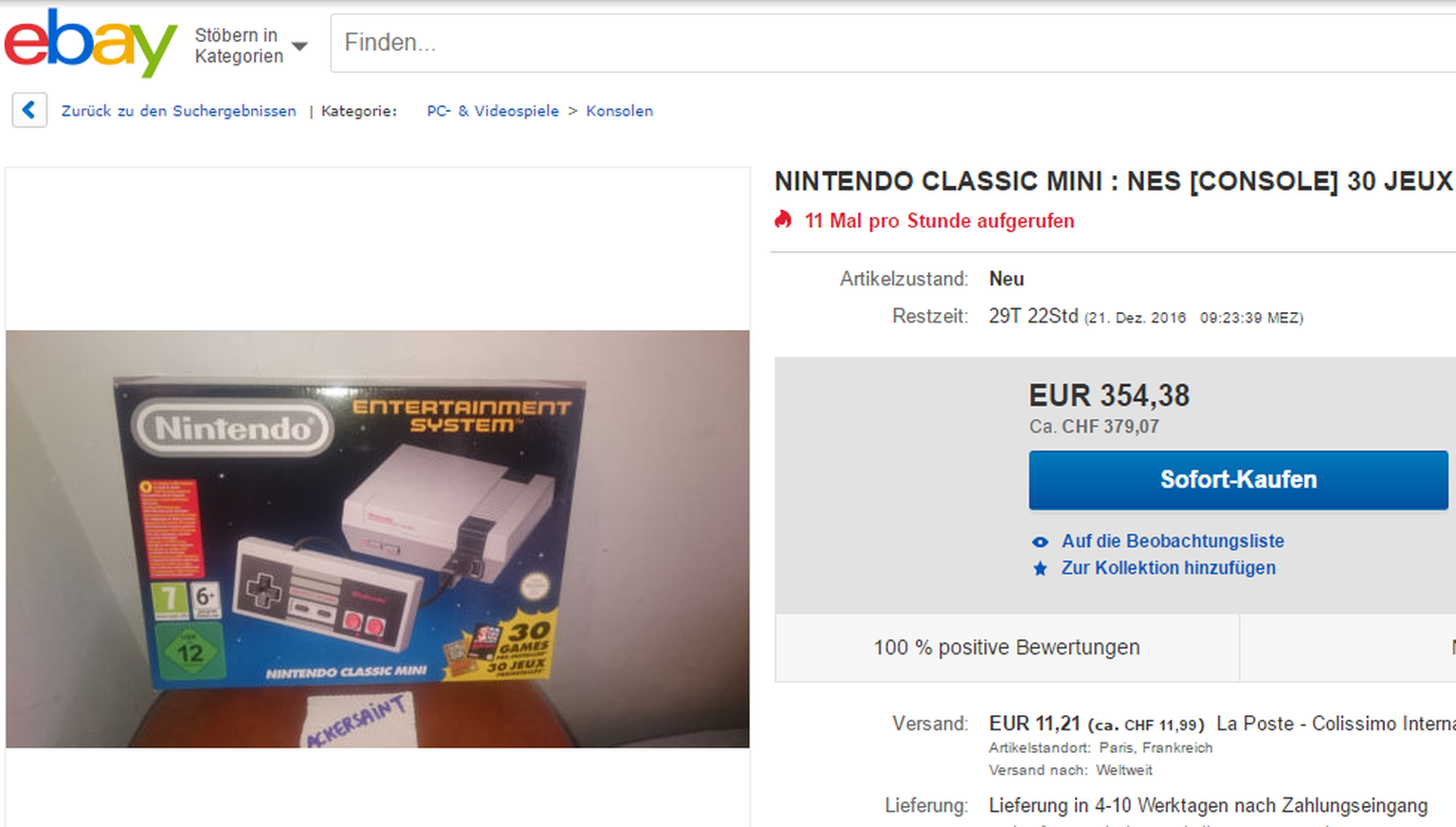 Ein Schnäppchen? Das Nintendo Classic Mini für gut 350 Euro bzw. 379 Franken auf eBay.