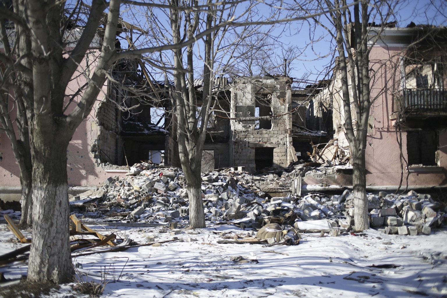 Blick auf zerbombte Gebäude in Mironovka, einem Nachbarstädtchen Debalzewos.
