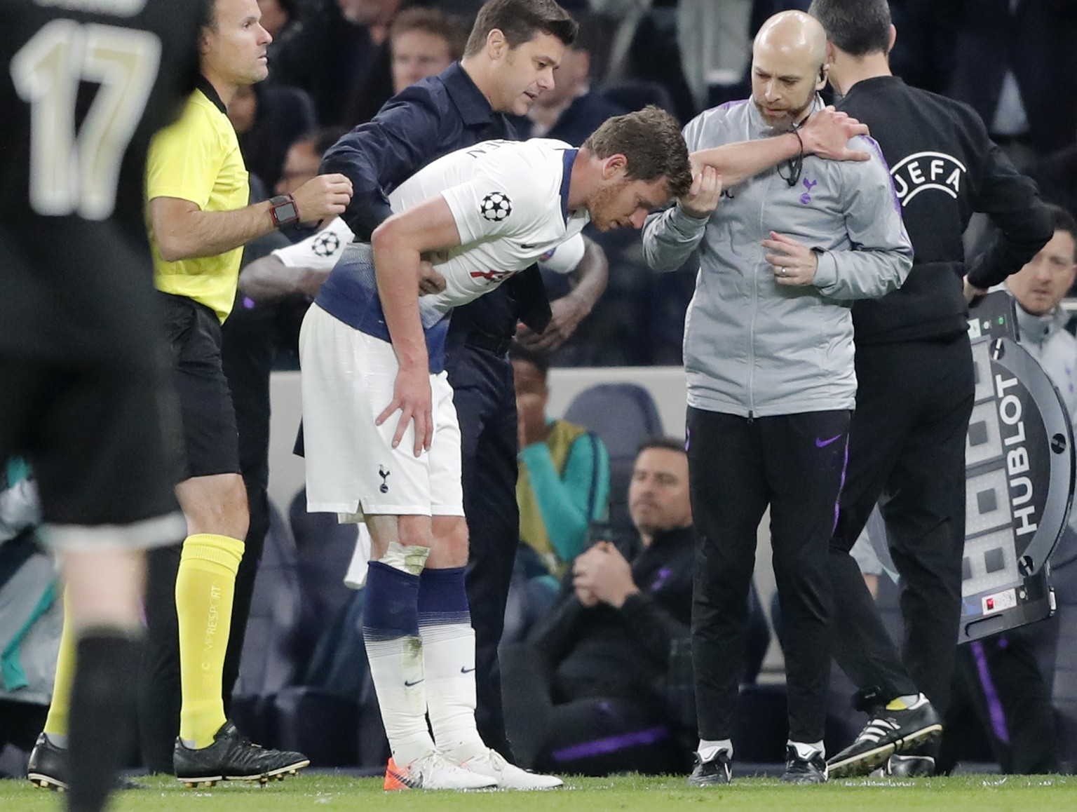 Jan Vertonghen muss von Trainer Maurcio Pochettino gestützt werden.