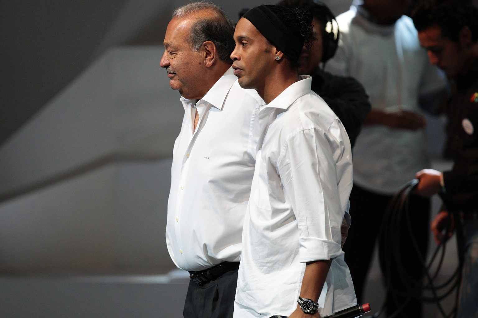 Ronaldinho Gaucho mit dem Mexikaner Carlos Slim, dem reichsten Menschen der Welt, bei der gestrigen Veranstaltung von seiner Firma Telmex Foundation.
