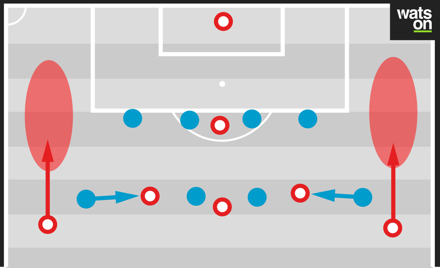 Die Schweizer Aussenstürmer ziehen den Gegner durch ihr Einrücken ins Zentrum, die Aussenverteidiger nutzen den freien Raum auf dem Flügel zum Hinterlaufen.