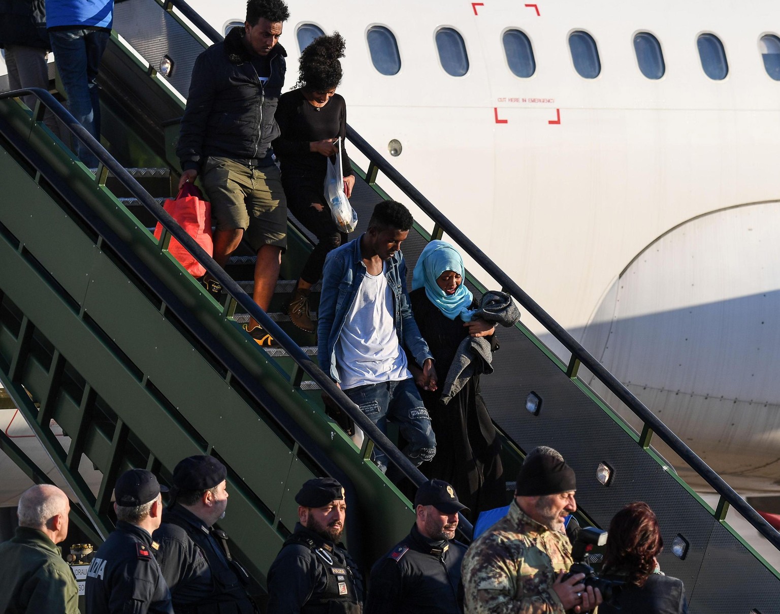 Flüchtlinge verlassen ein Flugzeug in Rom, nachdem sie aus Libyen evakuiert wurden.