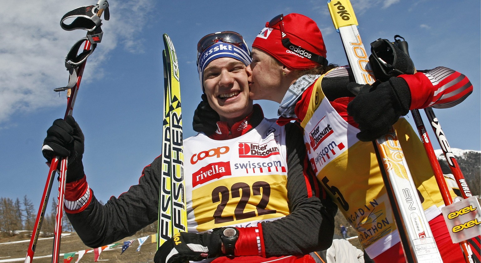 Prominente Ehrendame: Die Frauensiegerin Laurence Rochat gratuliert Dario Cologna zu seinem Sieg.