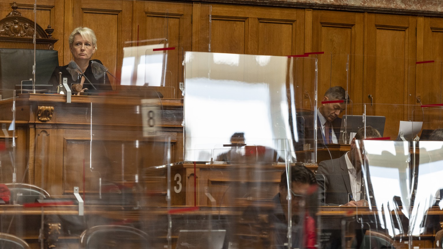 Nationalratspräsidentin Isabelle Moret hinter ganz vielen Plexiglasscheiben.