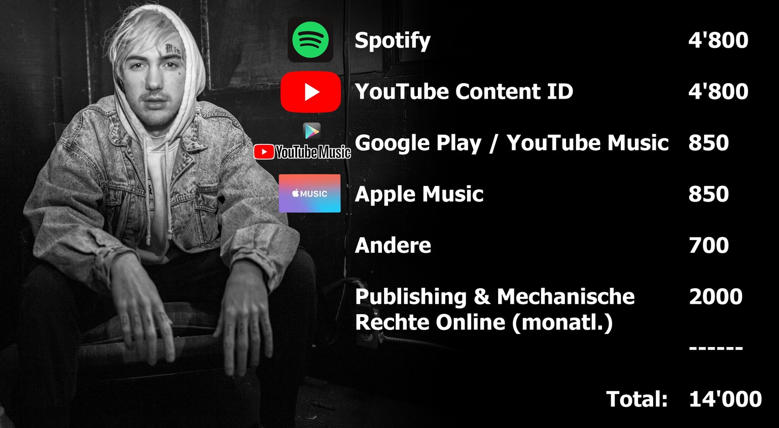 Das Management von Panda Eyes hat uns eine vereinfachte Abrechnung für seine Einkünfte eines Durchschnittsmonats zusammengestellt. Nicht darin enthalten sind die Ausgaben. Diese betragen im Monat zwischen 2000 und 3000 Franken.