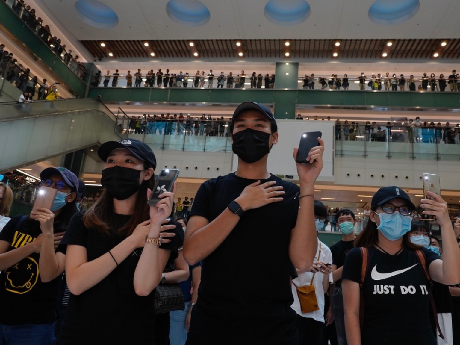 Die singenden Demonstranten in einem Einkaufszentrum.