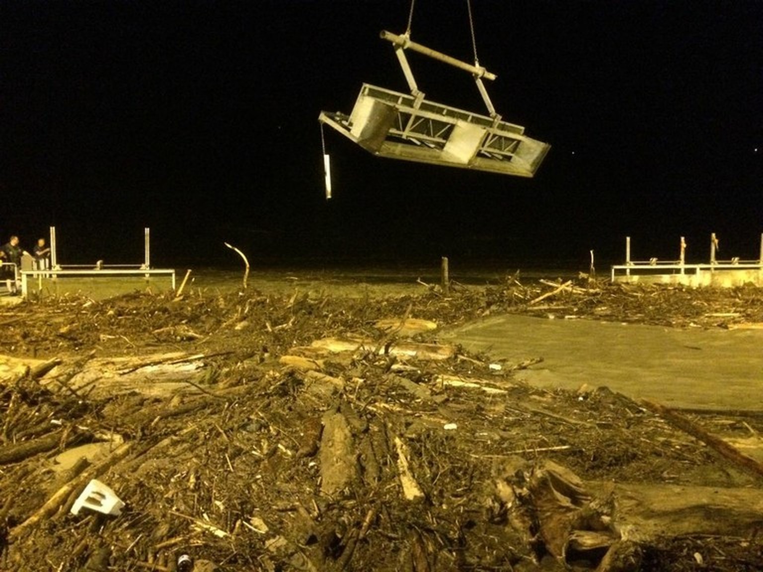 Die Berner Feuerwehr entfernt im Schwellenmätteli in der Stadt Bern ein mobiles Schwellenelement. Darauf entschärfte sich die Hochwasser-Situation.