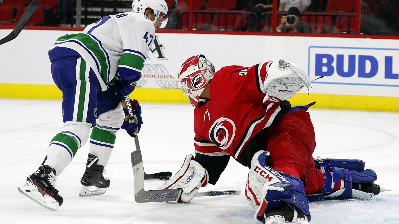 Nervenstark: Sven Bärtschi vernascht Carolinas Goalie Curtis McElhinney.