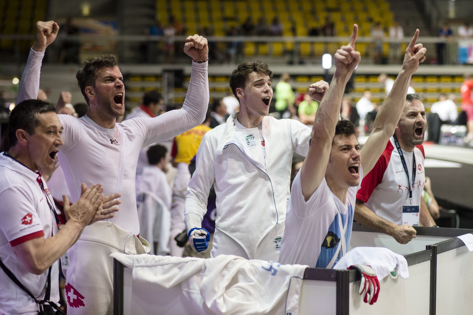 Vor der Entscheidung im Halbfinale: Das Schweizer Team mit Benjamin Steffen, Peer Borsky und Fabian Kauter bejubelt einen Treffer von Max Heinzer.