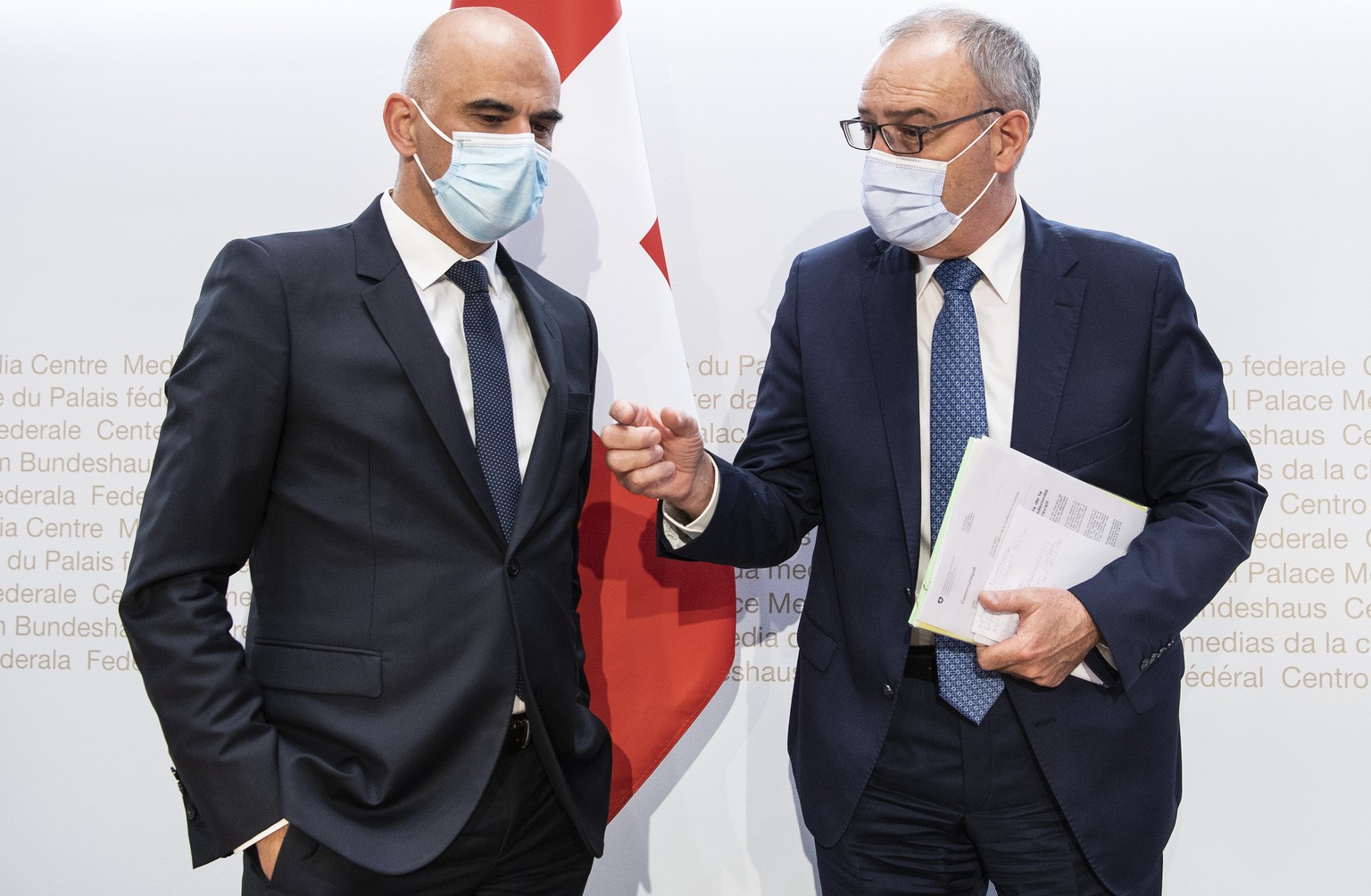 Alain Berset und Guy Parmelin im Gespräch: Noch will der Bundesrat das Zertifikat nicht weiter einsetzen.