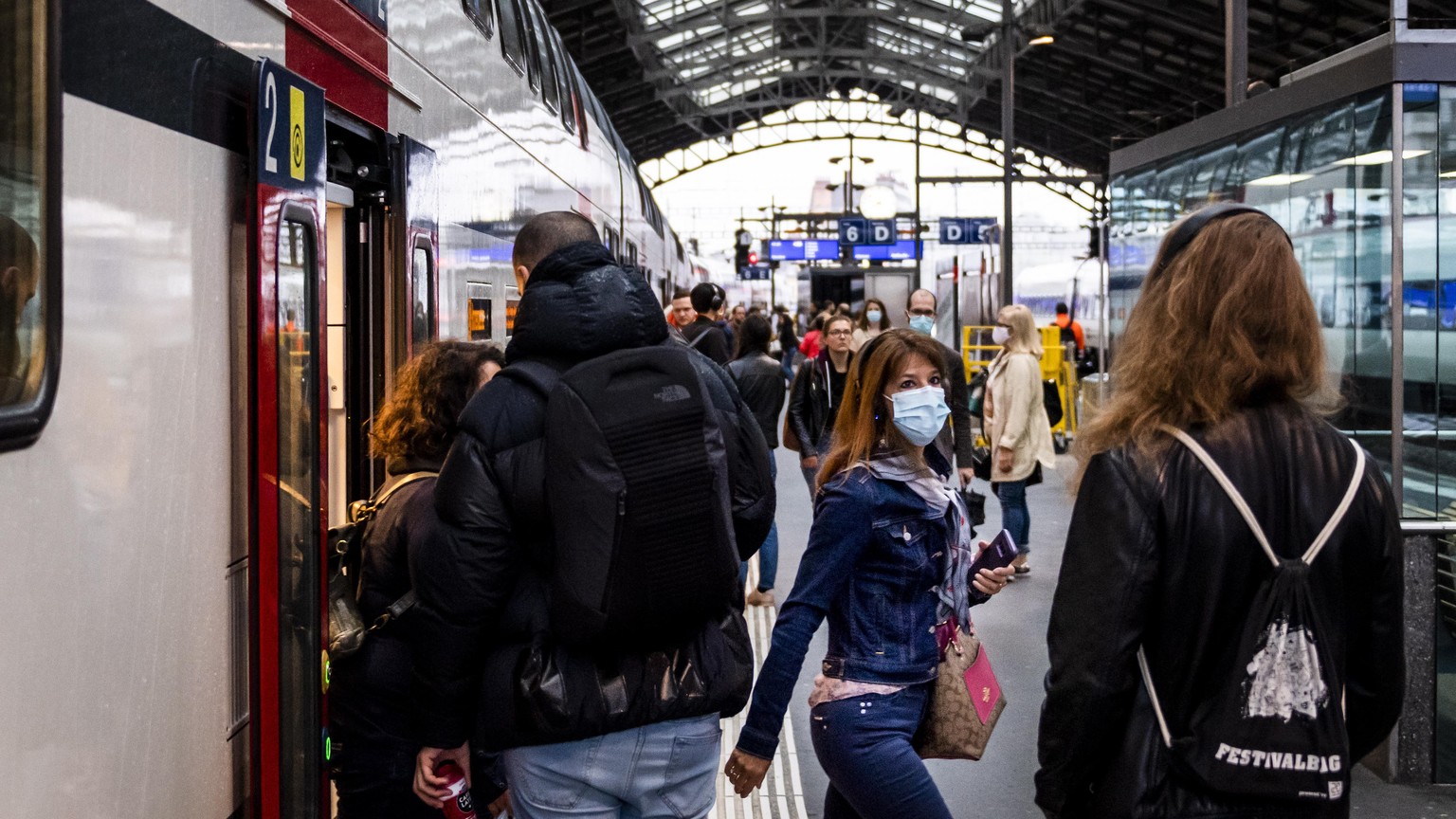 Eine Pendlerin mit Maske am Bahnhof in Lausanne.