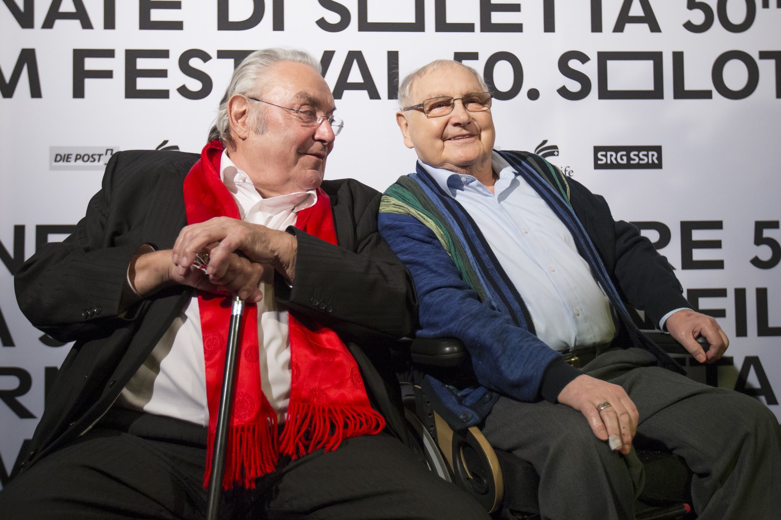 Mathias Gnädinger, links, und Jörg Schneider, rechts, bei der Filmpremiere ihres Films «Usfahrt Oerlike».