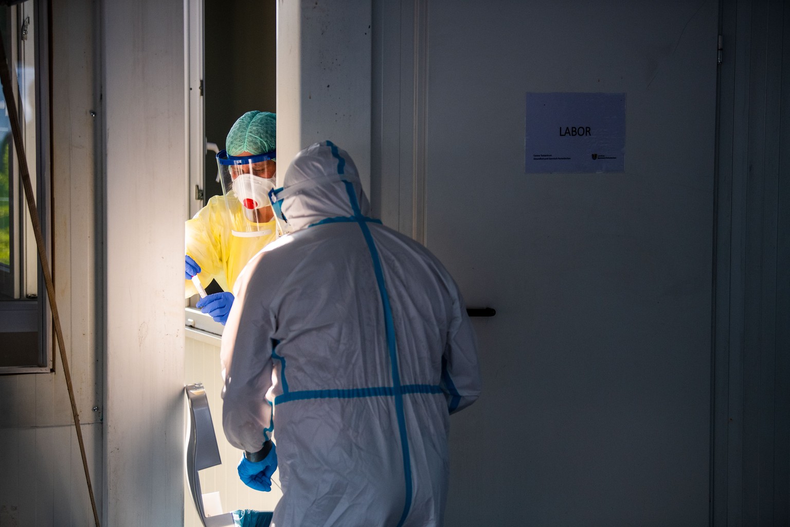Ein Mitarbeiter des Testzentrums Garmisch-Partenkirchen übergibt ein Teströhrchen zu einer Mitarbeiterin im Laborcontainer.