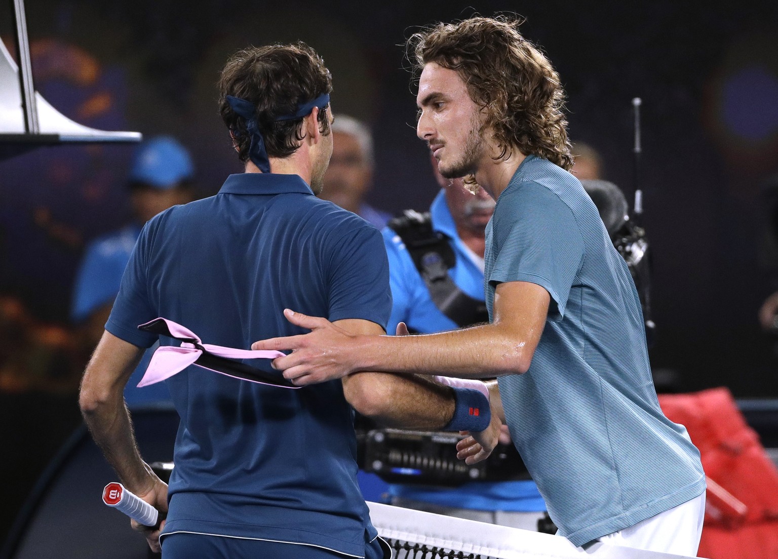 Fast schon ehrfürchtig lässt sich Tsitsipas von Federer zum Sieg gratulieren.