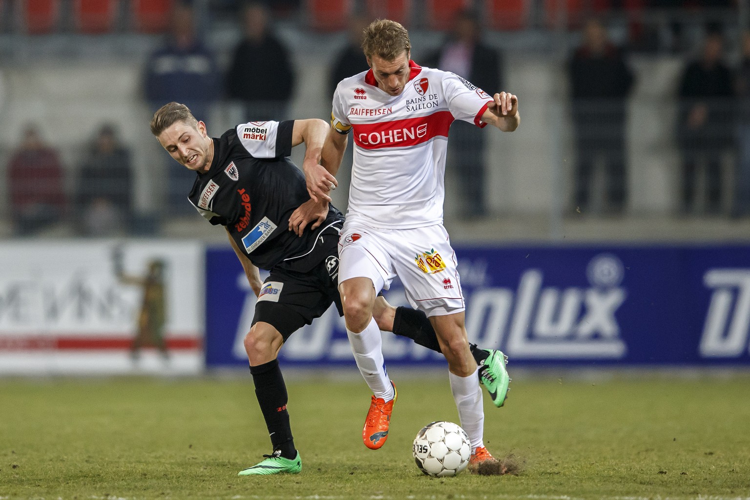 Torschütze Stephan Andrist wird von Arnaud Bühler bedrängt.