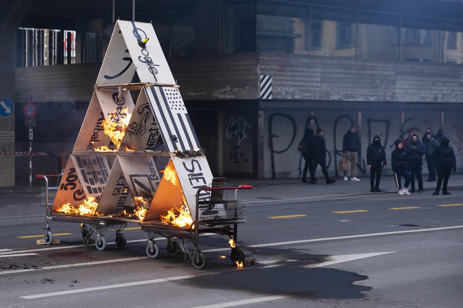 Am Bollwerk verbrannten die Demonstranten ein symbolisches Kartenhaus in Anspielung auf das Motto der Kundgebung: «Das Kartenhaus zum Einsturz bringen.»