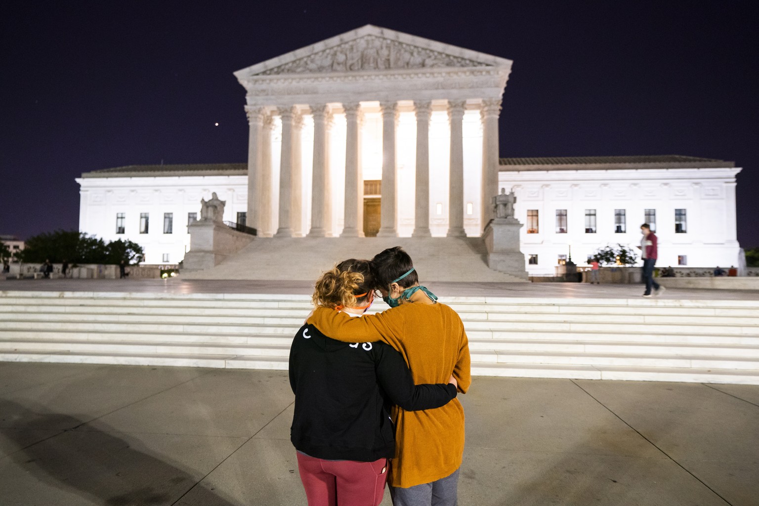 Trauerndes Paar vor dem Gebäude des Supreme Court in Washington.