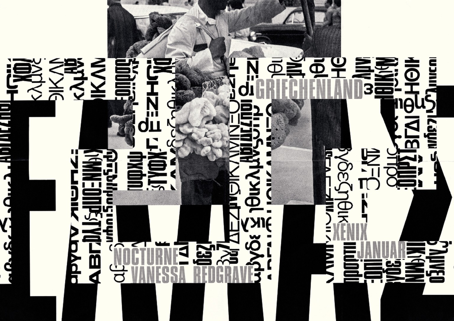 Griechische Schriftzeichen, ein Mäander-Band aus internationalen Alphabeten, ein Schwammverkäufer – und was will uns dies im Januar 1994 sagen? Etwa, dass alle westlichen Kulturen irgendwie auf der Antike beruhen und diese wie Schwämme aufgesogen haben?