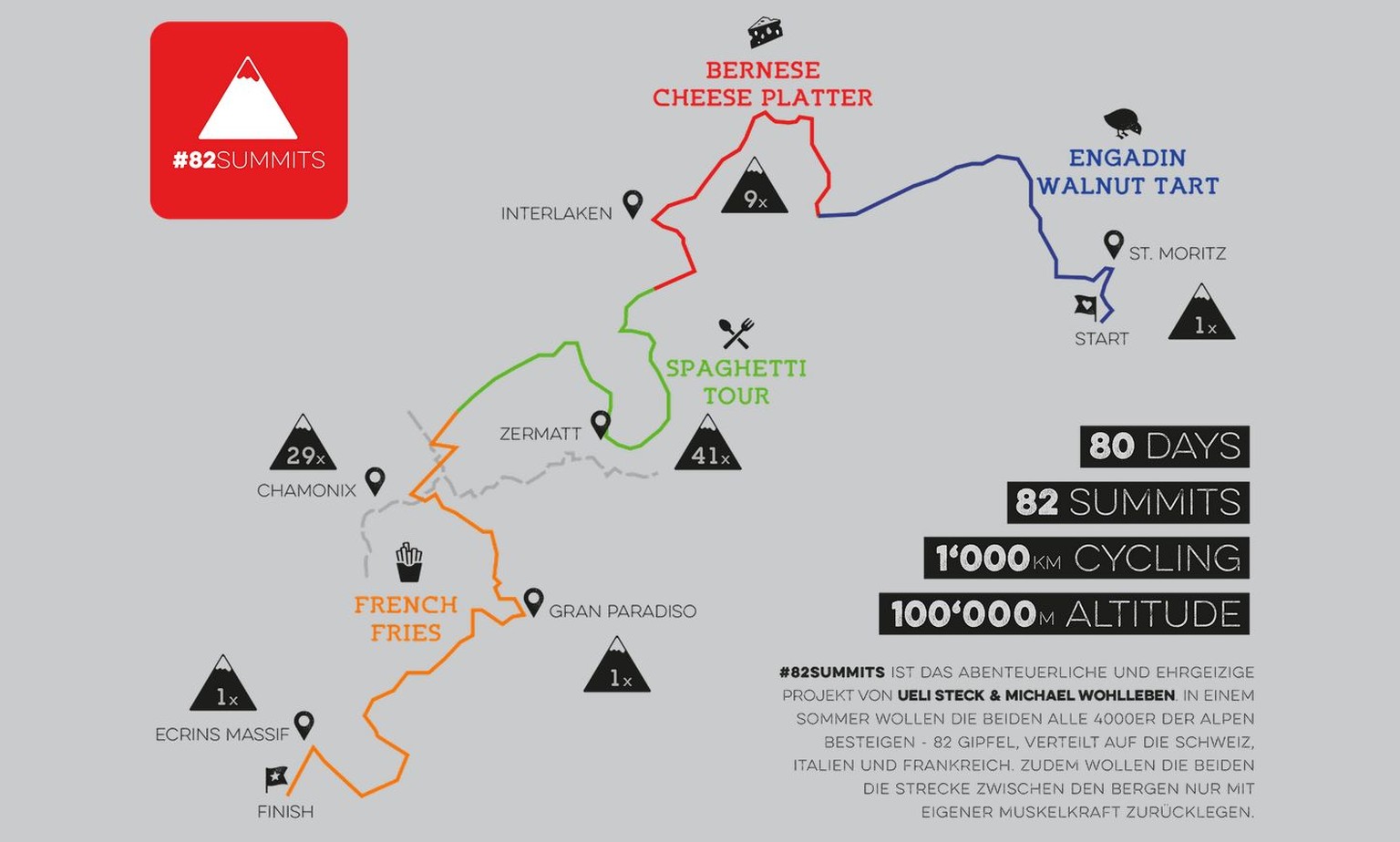 Die Tour beginnt im Engadin und endet in den französischen Alpen.