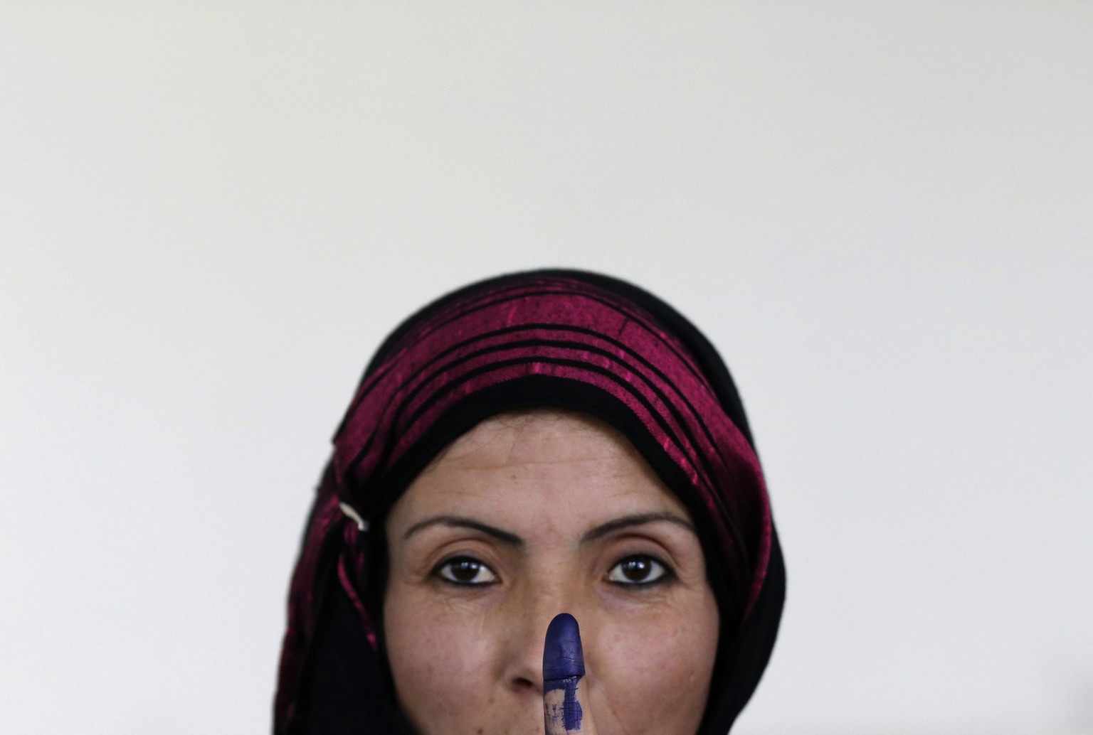 Eine Frau in Kabul hält ihren mit Tinte verschmierten Finger in die Höhe, nachdem sie gewählt hat.