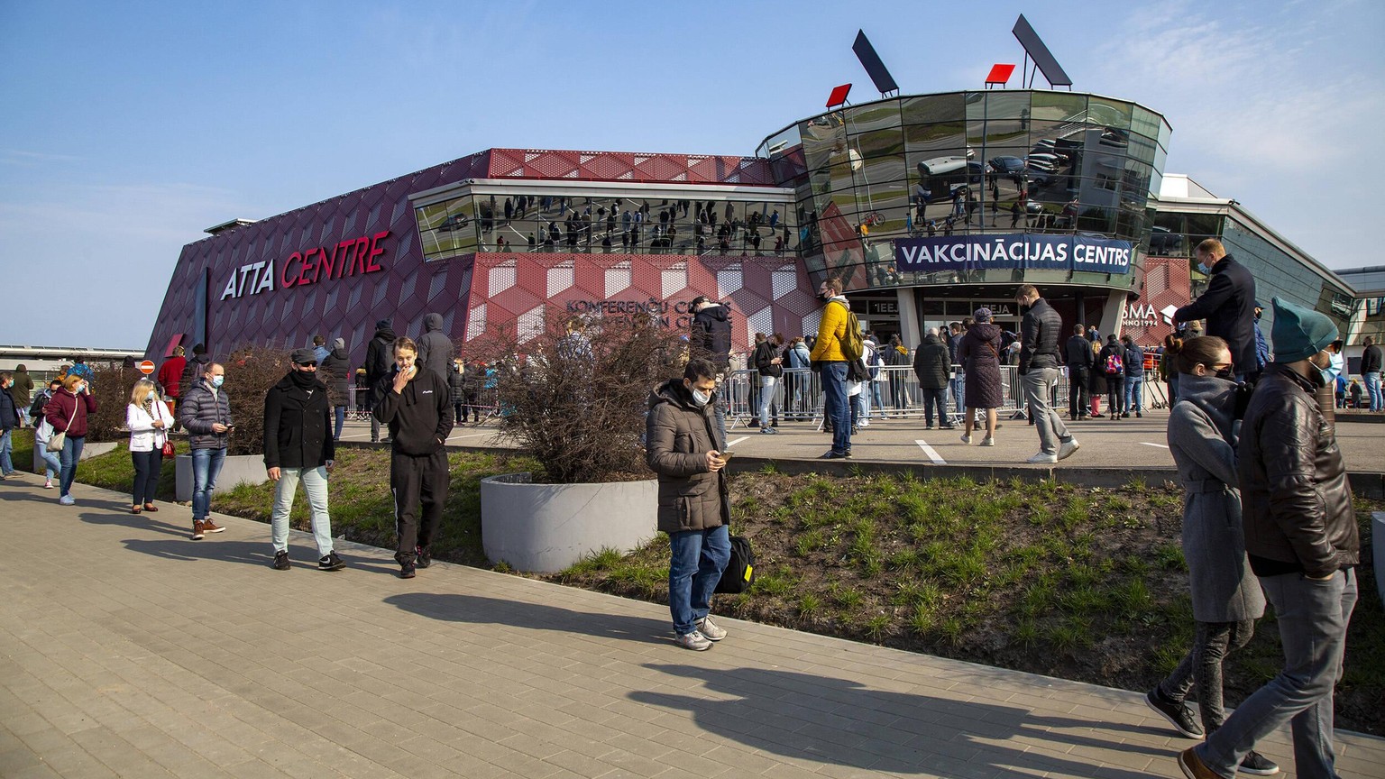 Rigas Einwohner stehen Mitte April an, um geimpft zu werden.
