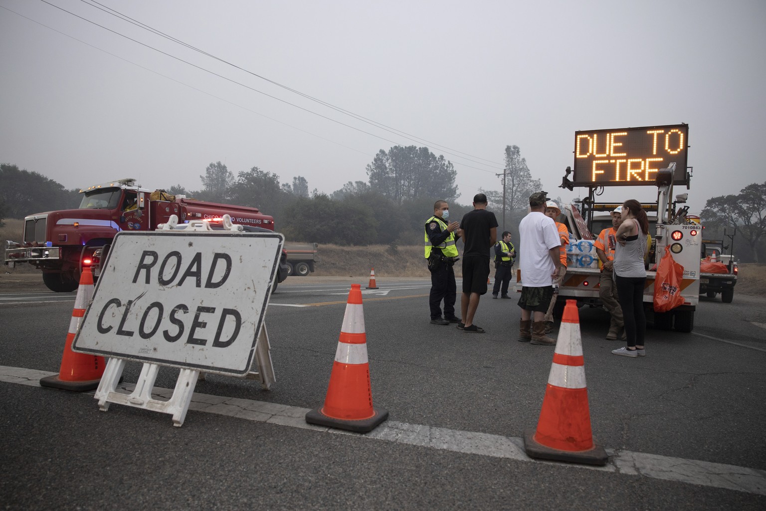 Bewohner der Ortschaft Berry Creek sprechen mit Beamten bei einer Strassensperre.