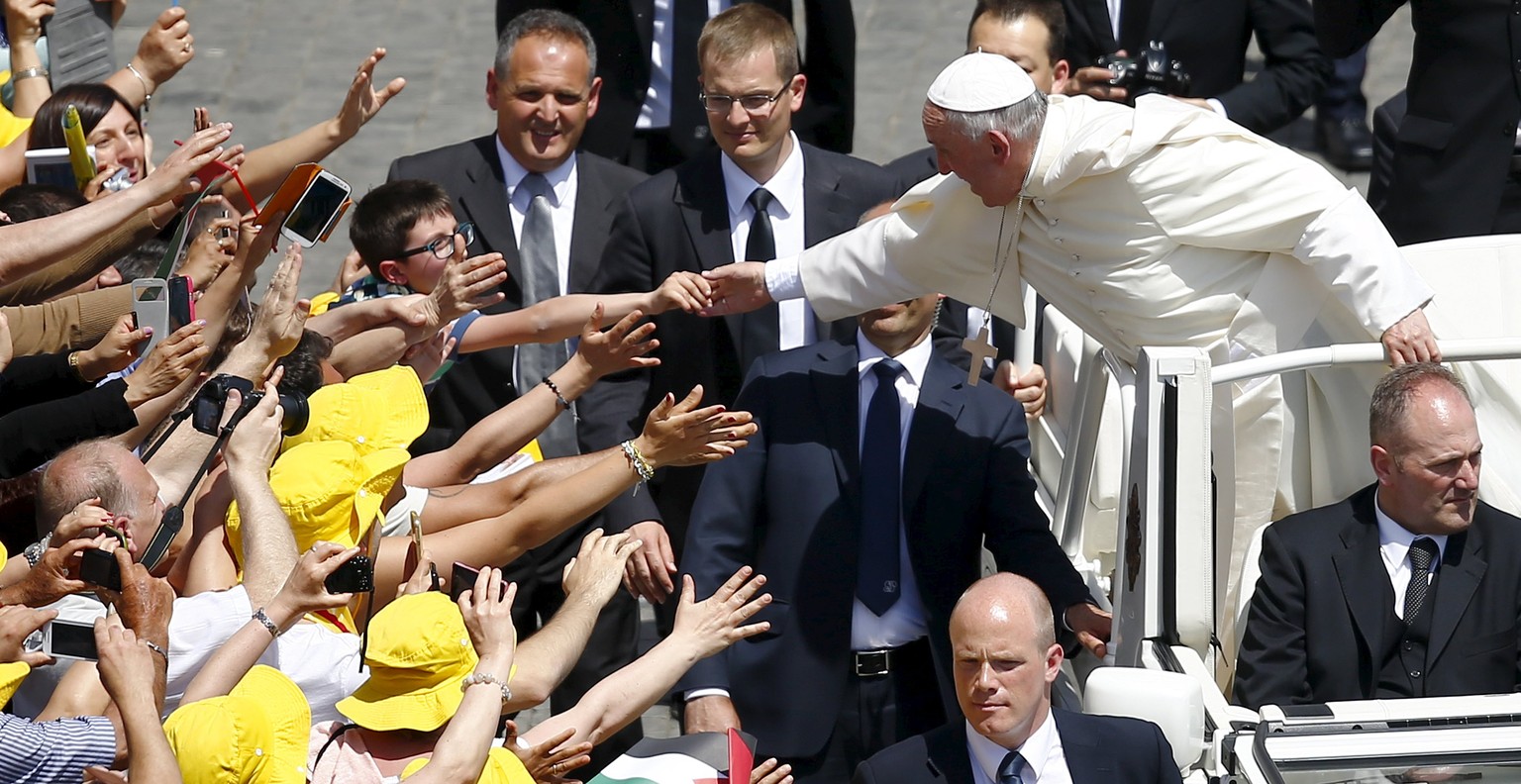 Papst Franziskus grüsst nach der Heiligsprechung auf dem Petersplatz die Menge.