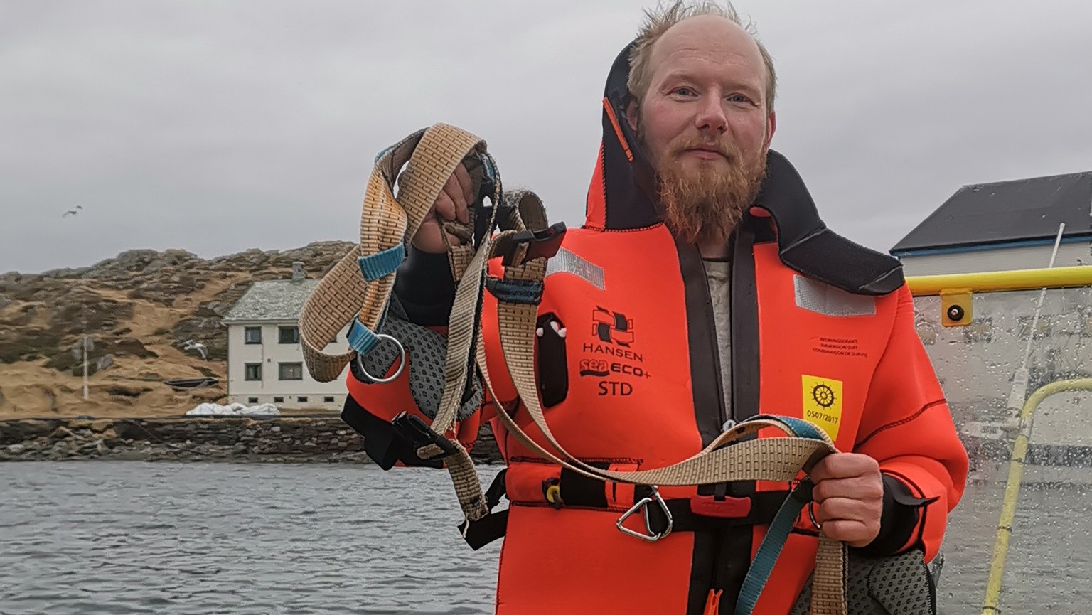 Joergen Ree Wiig mit dem Geschirr des Wales.