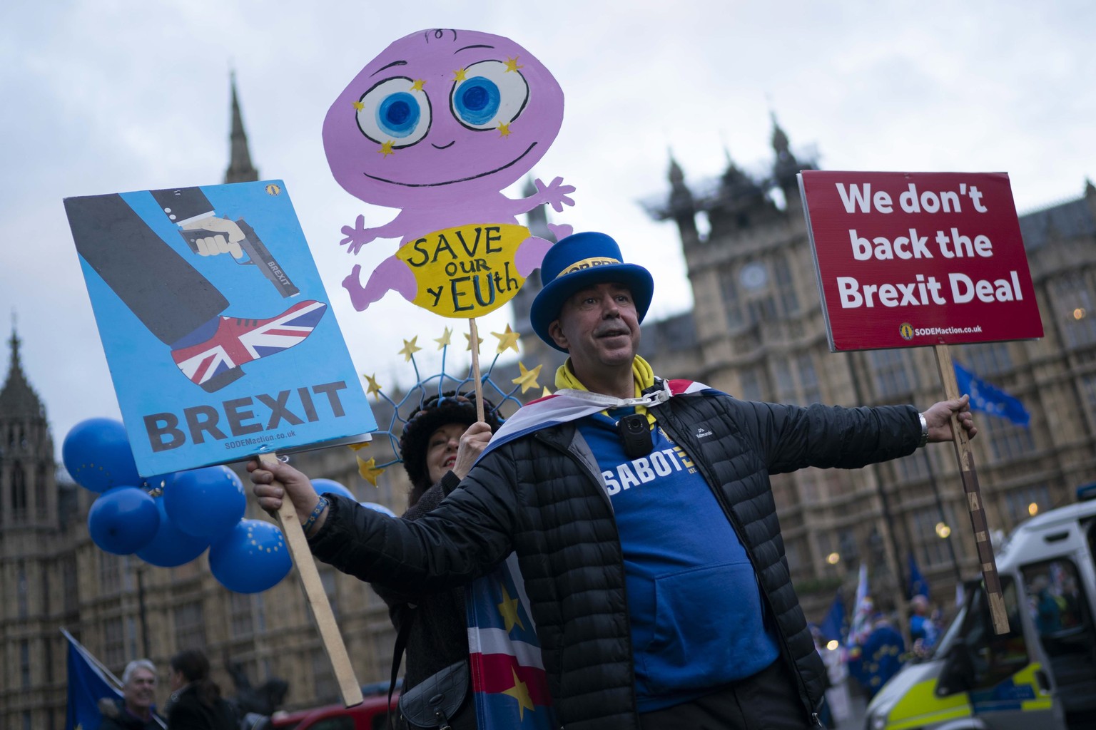 Mit einer Mischung aus Karneval und Protest wollen Demonstranten vor dem Parlamentsgebäude in London eine zweite Brexit-Abstimmung erzwingen.
