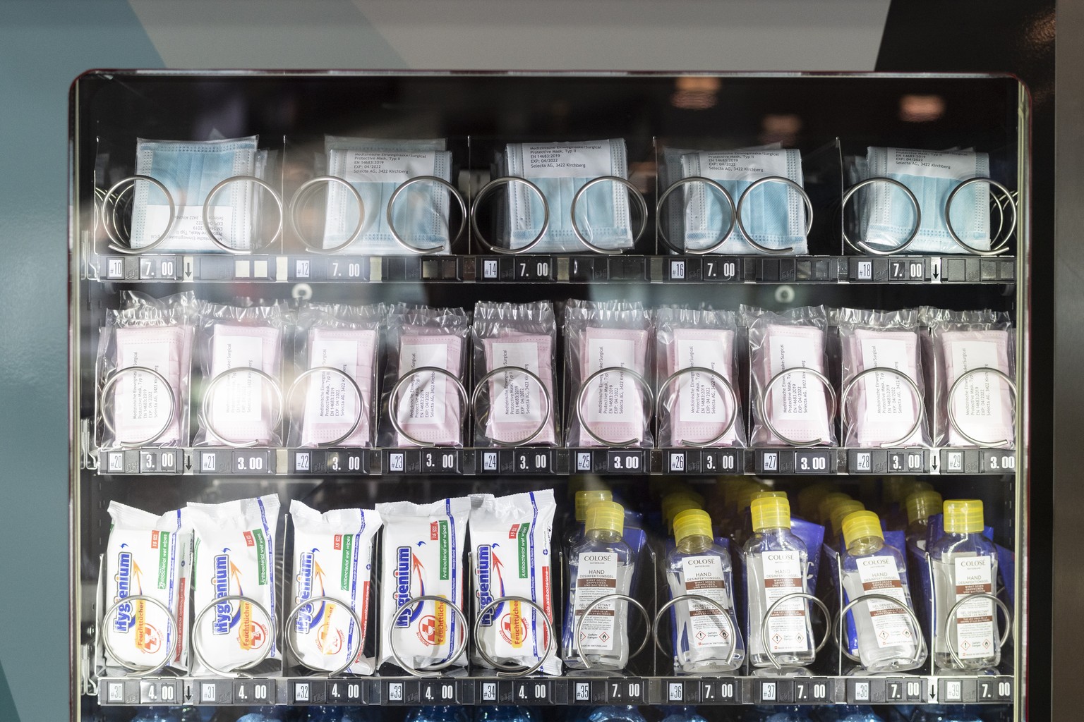 Atemschutzmasken im Verkaufsautomaten Selecta am Flughafen Zürich.