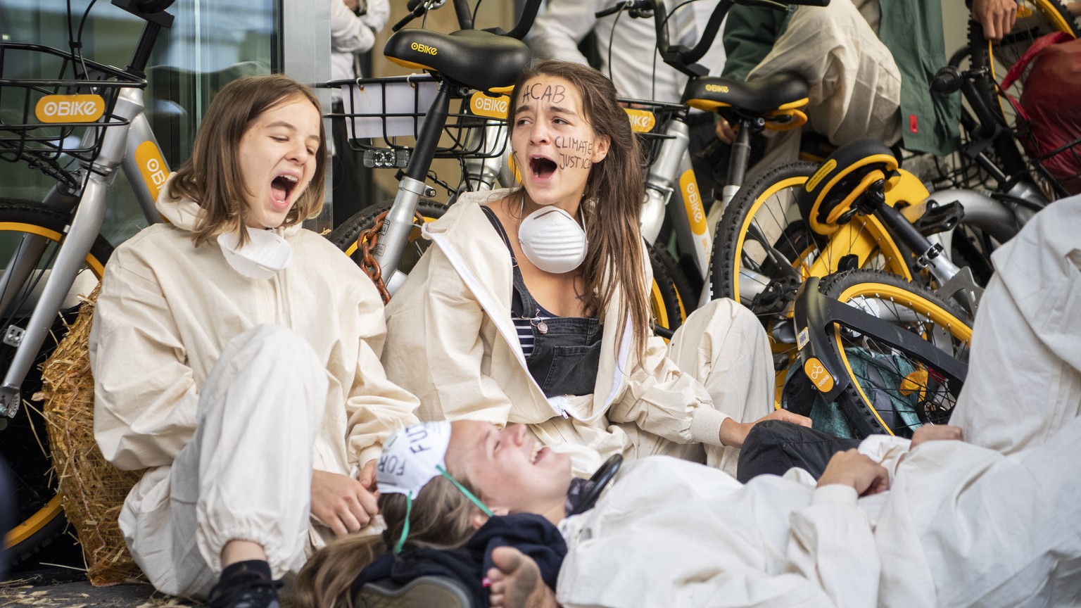 Eine Gruppe Klimaaktivisten der Organisation Clima Justice blockiert den Eingang der Schweizer Banken UBS und Credit Suisse im Juli 2019.