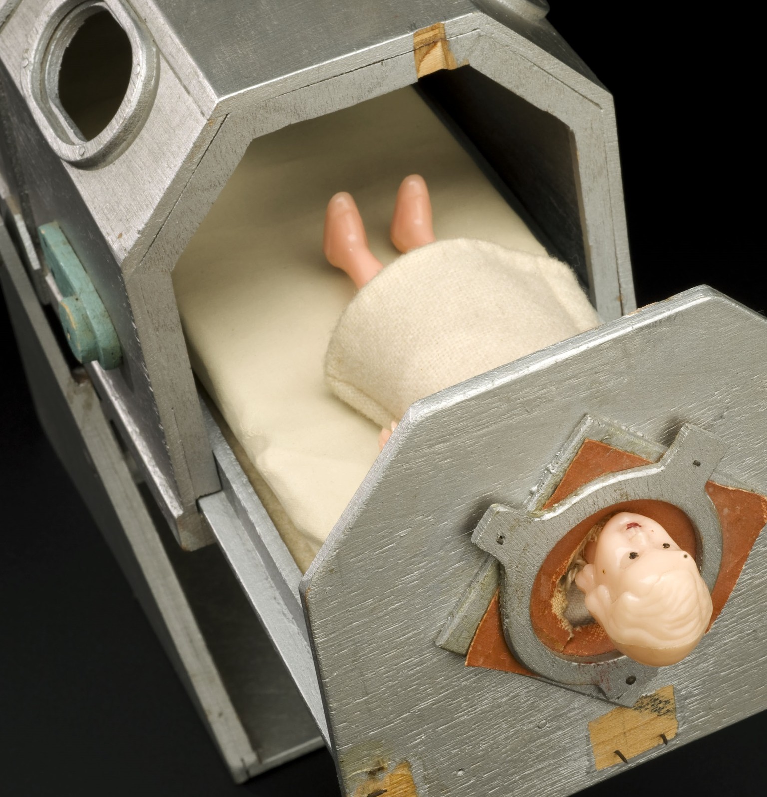 Eine Übungspuppe in einer hölzernen Lunge, die wahrscheinlich für die Demonstration der prospektiven Behandlung von an Polio erkrankten Kindern verwendet wurde. Die Holzversion des Drinker-Respirators wurde in Grossbritannien während des Zweiten Weltkrieges in den Werken des britischen Automobilherstellers William Morris in grosser Stückzahl