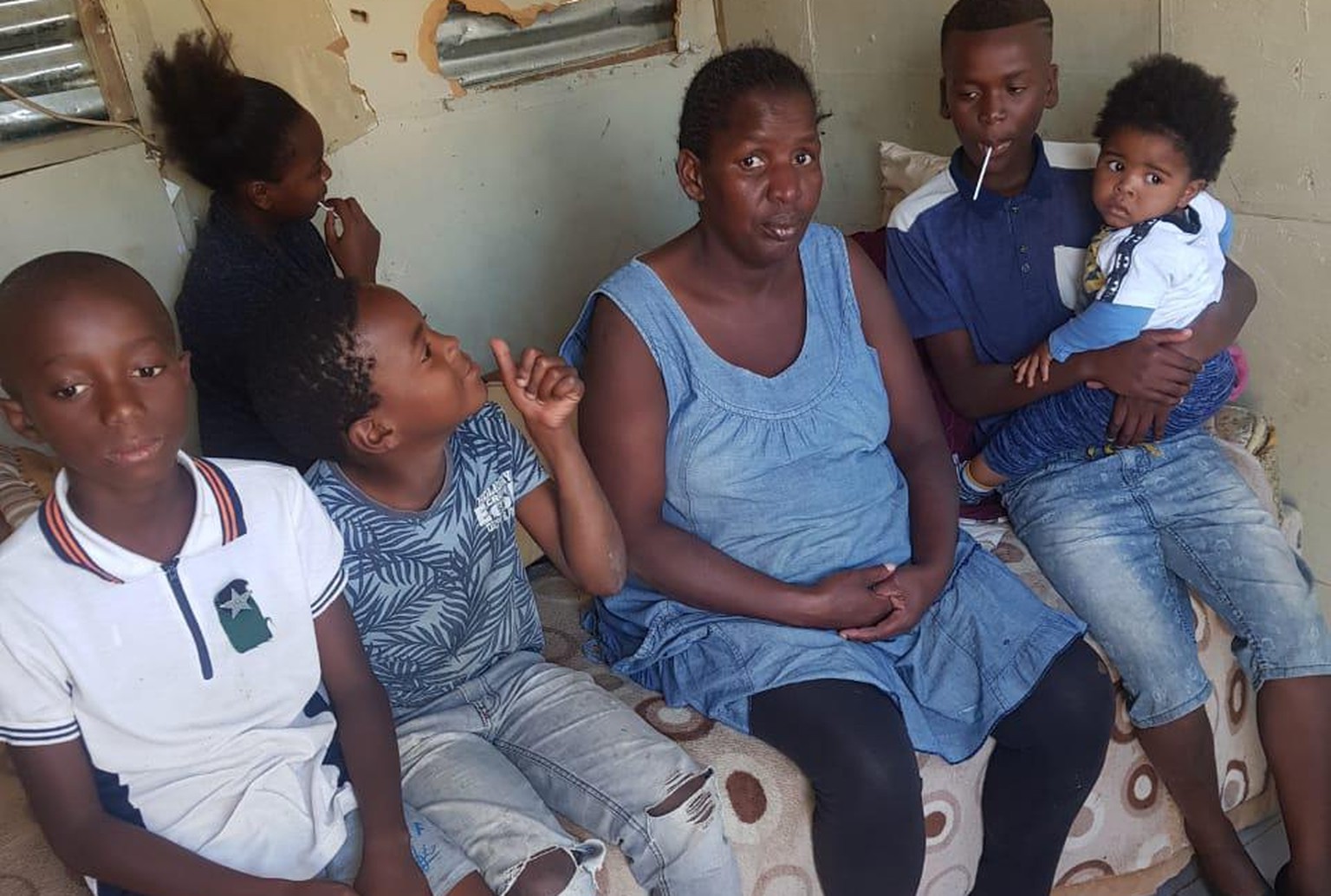 Eine alleinerziehende Mutter mit ihren fünf Kindern. Während des Lockdowns hat sie keine Chance auf Einkünfte.
