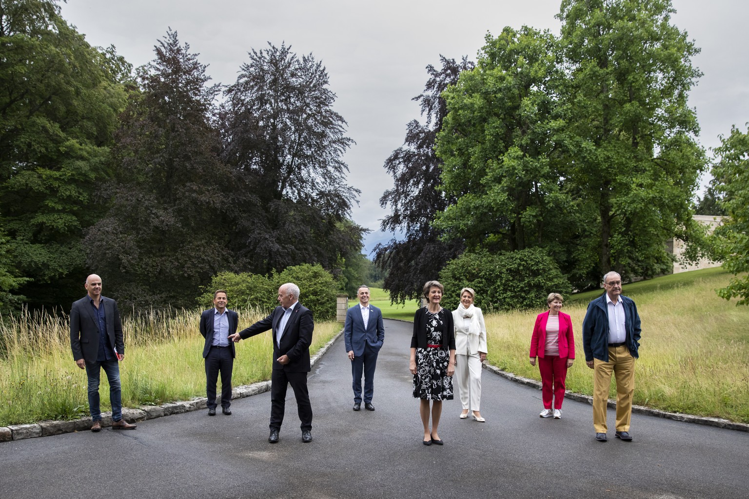Schulreise des Bundesrats in Coronazeiten. Die Mitglieder lassen sich im Zwei-Meter-Abstand fotografieren, der im Juni noch gültig war.