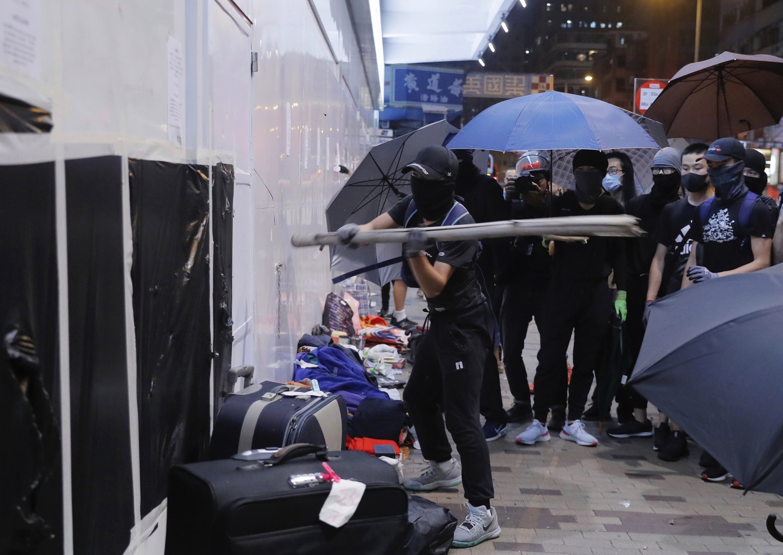 Wütende Demonstranten demolieren eine Wand der Bank of China.