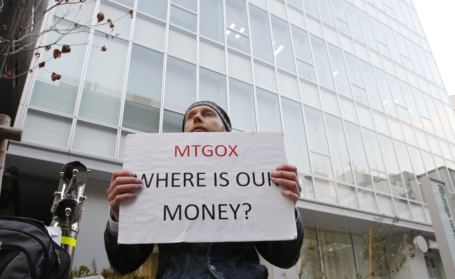 Wo ist unser Geld? Ein Bitcoin-Anhänger vor dem Hauptquartier von Mt. Gox in Tokio.