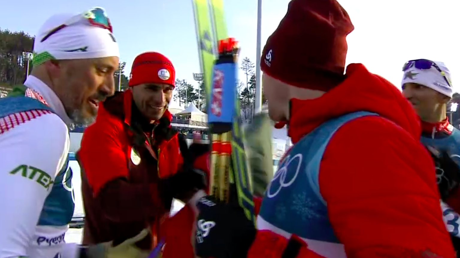 Handschlag der Champions: Olympiasieger Cologna und Langlauf-Exot Taufatofua beglückwünschen sich.