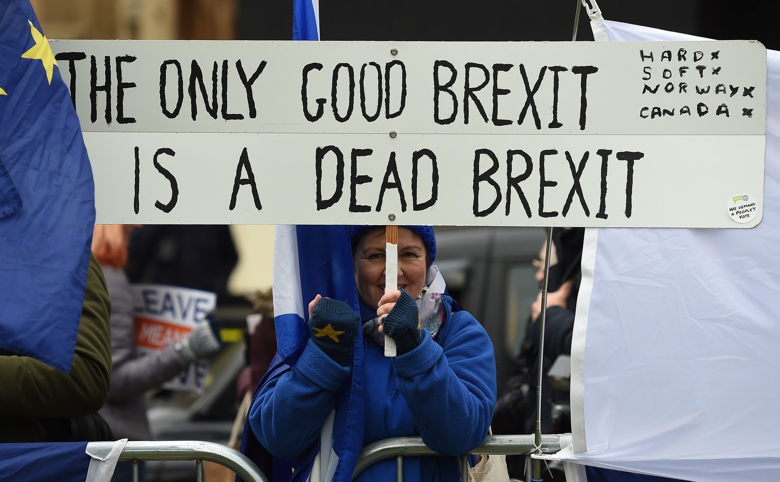 Klare Ansage einer Austrittsgegnerin vor dem Parlament in London.